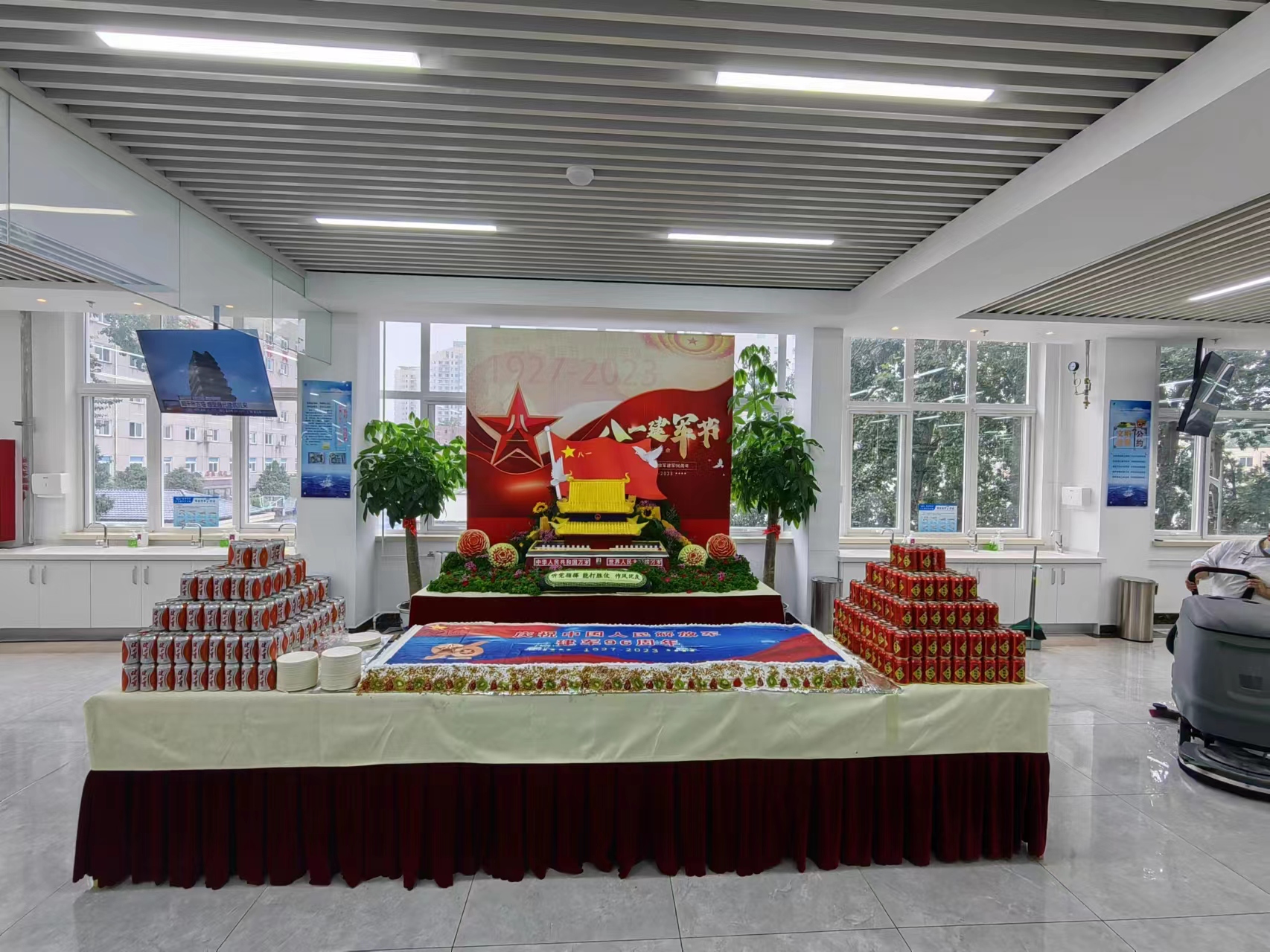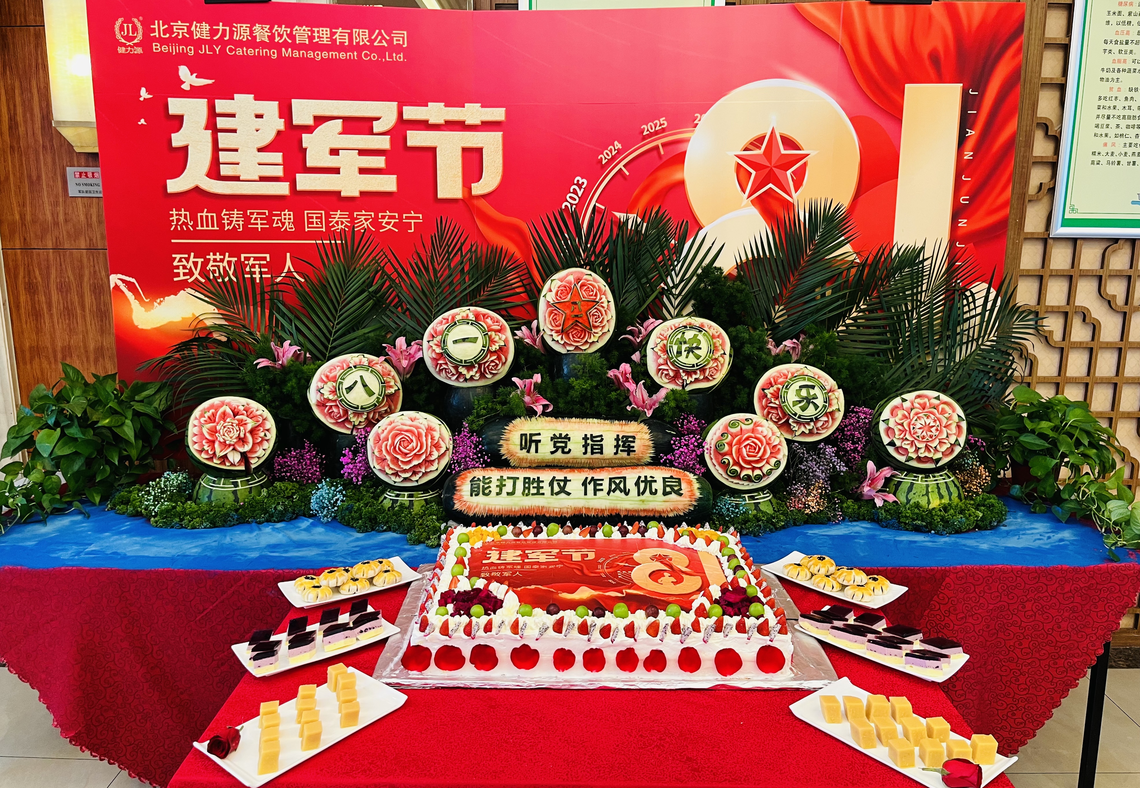 活動當天,各餐廳紛紛精心裝飾,紅色的背景板、紅色的展架、紅色的桌布、紅色的蛋糕,有的餐廳還用紅色可樂瓶拼成“八一”字樣,觸目皆是中國紅。96年來,正是這一抹紅色護衛(wèi)著祖國大地,守護著中華兒女。今天,健力源餐廳紛紛用中國紅裝點餐廳,致敬偉大的人民軍隊。