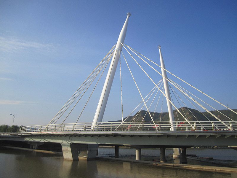 項目概況:省道赤寶線興仁堡至云州段湯泉河大橋為赤城縣一個標志性建筑,為滿足市民對交通出行的要求,提升道路周邊的景觀環(huán)境,同時帶動起周圍經(jīng)濟的發(fā)展,在湯泉河大橋兩側(cè)各修建一座人行景觀橋,橫跨湯泉河,此人行景觀橋造型美觀,為弧形梁斜塔斜拉景觀橋,橋梁跨徑70m,橋梁左幅跨徑組合為23.709+2×33+23.709+20m;右幅跨徑組合為29.209+2×33+23.709m,主跨部分采用鋼塔斜拉曲線鋼箱梁結構,橋塔采用傾斜鋼管截面。該橋兩側(cè)邊跨為預應力現(xiàn)澆箱梁,橋面凈寬3.5m。
