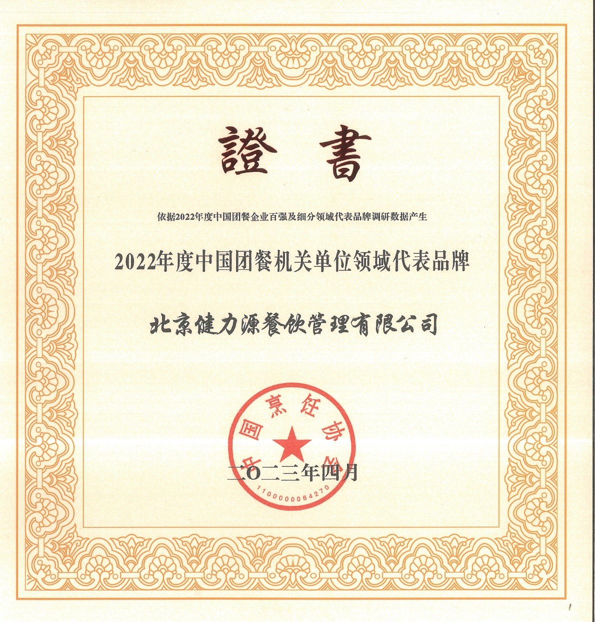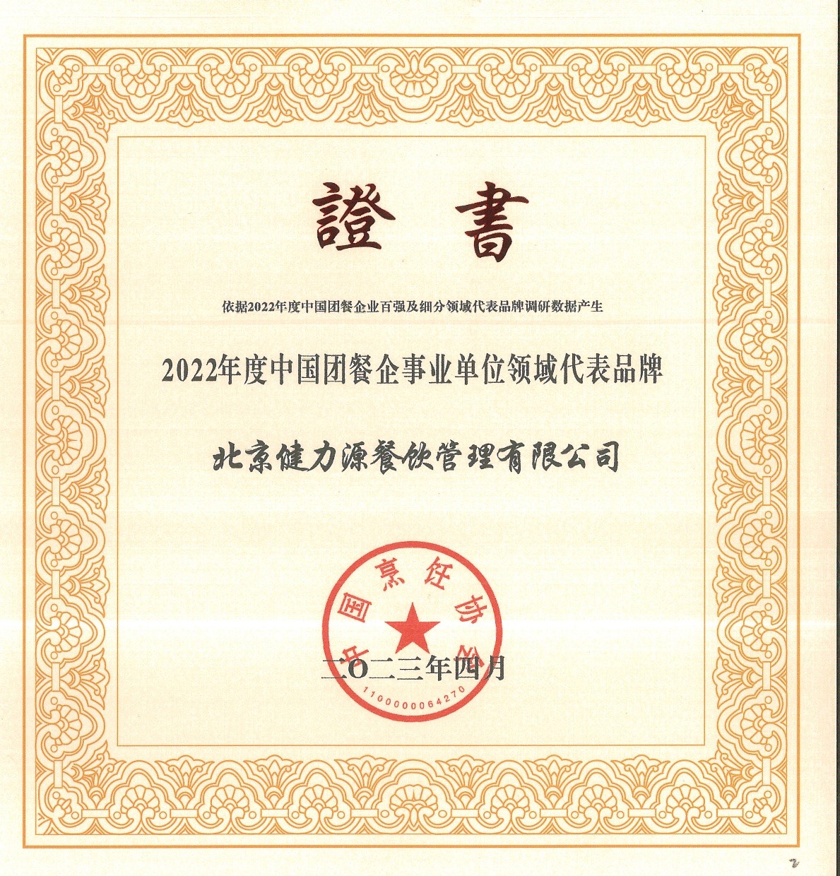 “2022年度中國團餐企業(yè)百強”榮譽證書