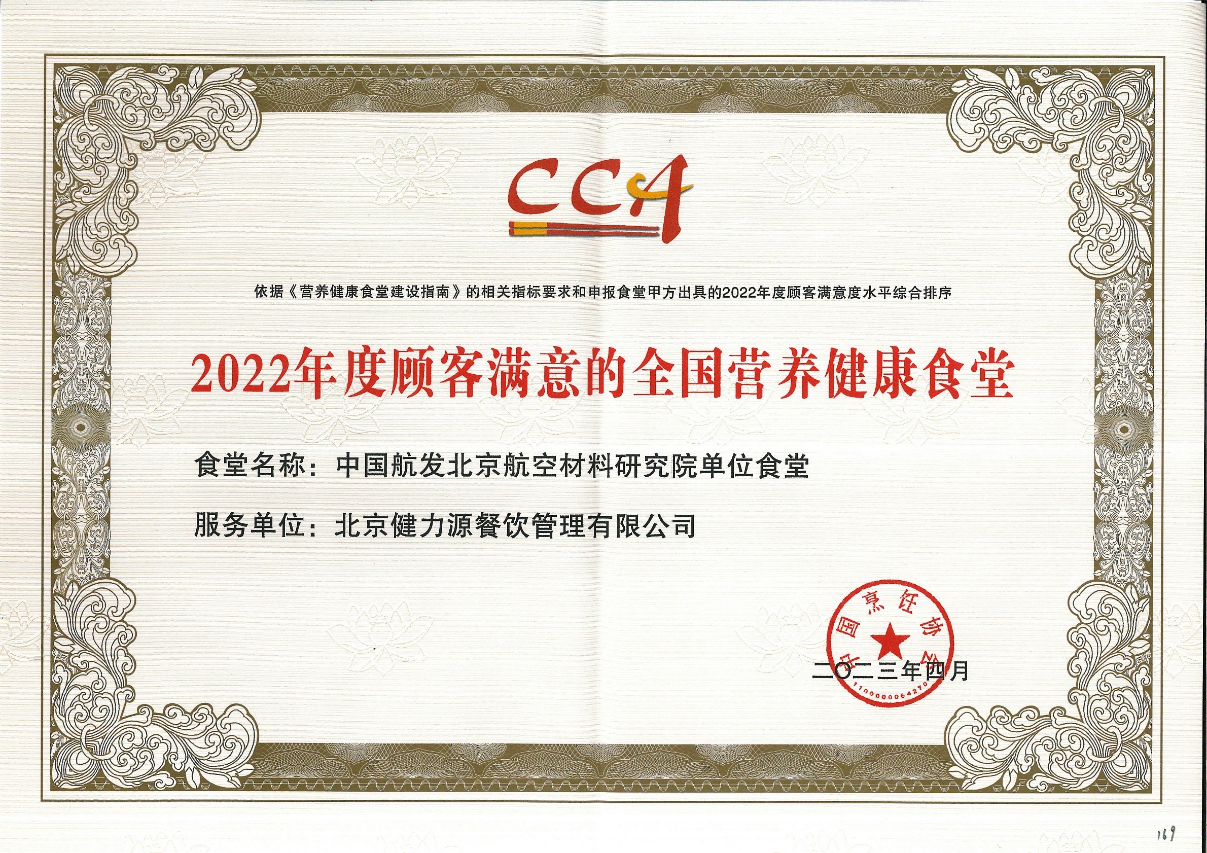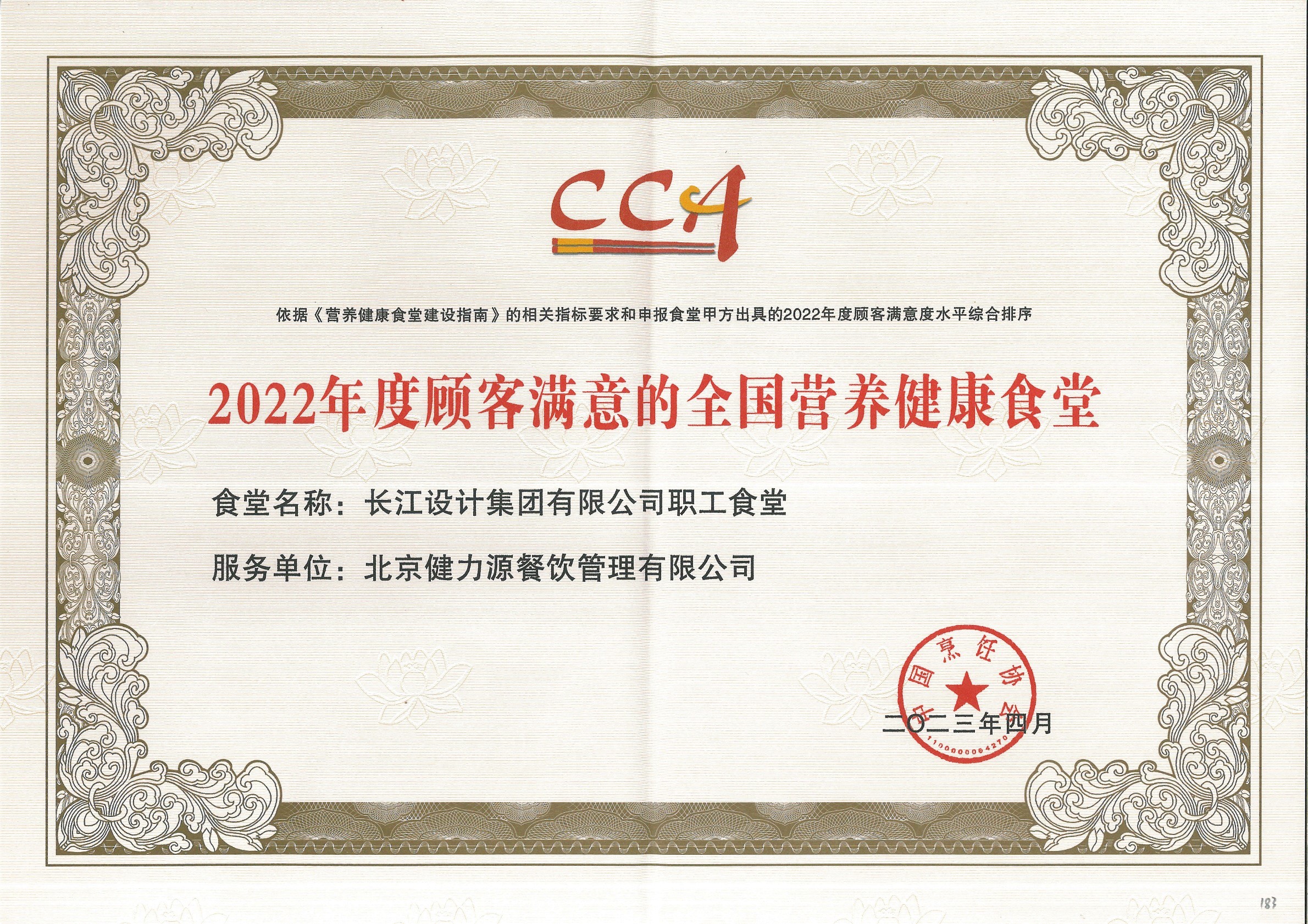 “2022年度顧客滿意的全國營養(yǎng)健康食堂”證書