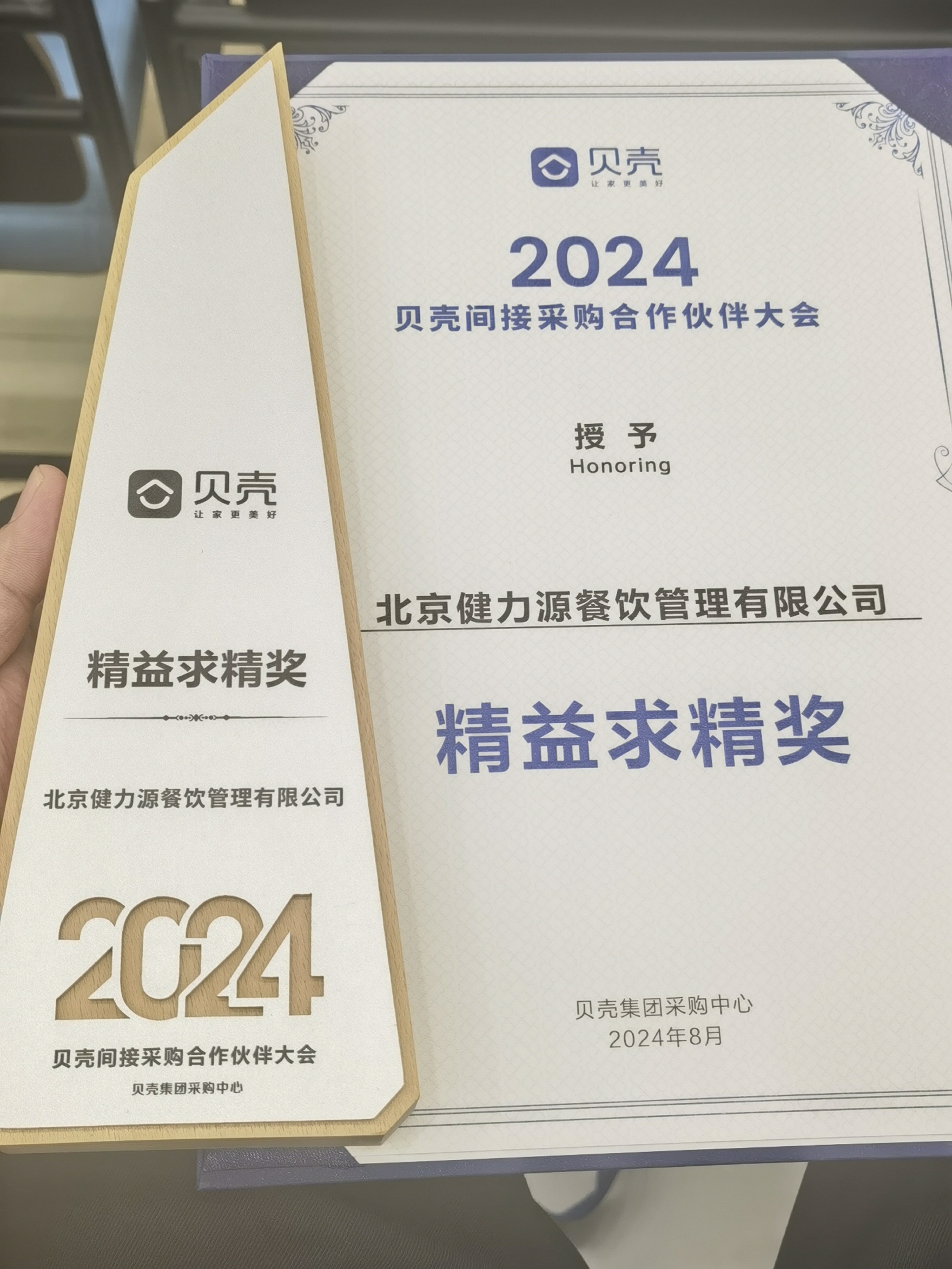 攜手貝殼,共進(jìn)共贏——北京健力源餐飲管理有限公司獲貝殼集團(tuán)頒發(fā)的“精益求精獎”