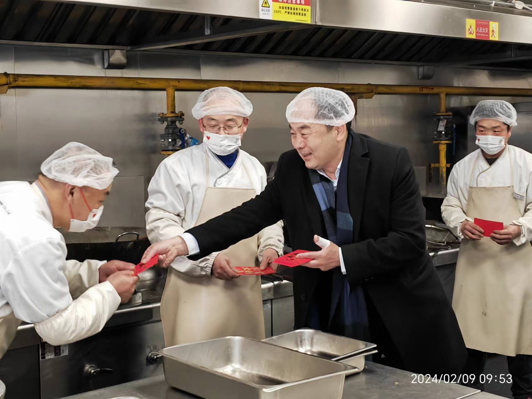 2月9日,農(nóng)歷大年除夕,在這舉國同慶、萬家團(tuán)圓的日子里,為了做好客戶年夜飯保障工作,集團(tuán)仍有2386名員工舍小家為大家,堅(jiān)守在工作崗位上。除夕當(dāng)天,薦世新董事長專門前往多家餐廳看望在崗的同事們。
