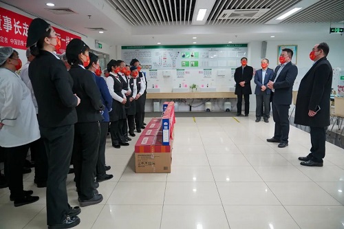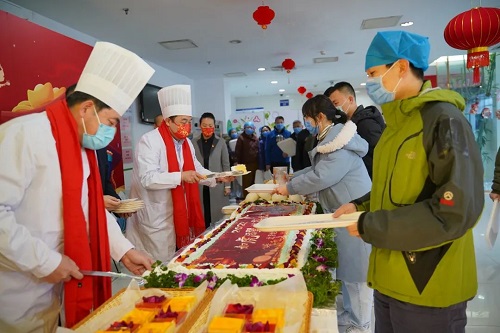 ▲薦董與北京地壇醫(yī)院領(lǐng)導(dǎo)一起為醫(yī)院職工分發(fā)蛋糕