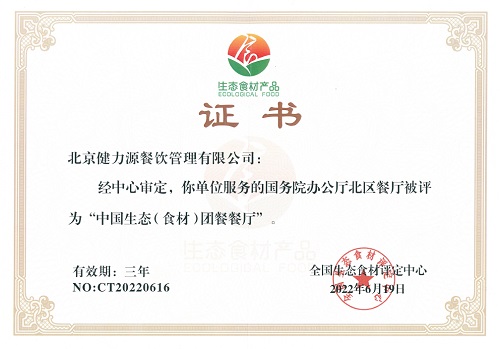 “中國生態(tài)(食材)團餐餐廳”證書