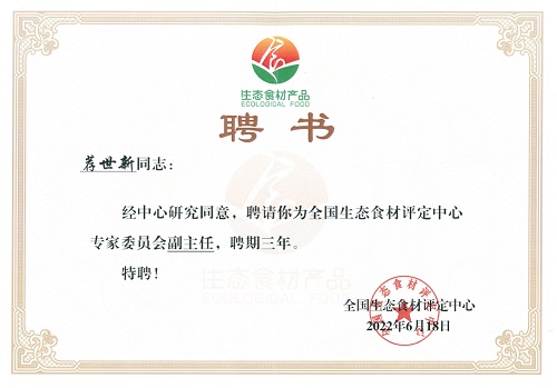“全國生態(tài)食材評定中心專家委員會副主任”聘書