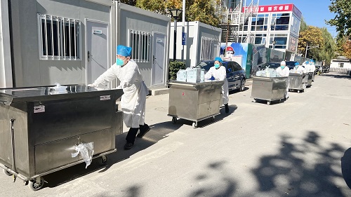 地壇醫(yī)院原餐廳目前正處于裝修階段,餐廳所有保障工作全部轉(zhuǎn)移到臨時板房中。臨時板房空間小,所有設(shè)備均是電氣設(shè)備,產(chǎn)能和效率大大降低,導(dǎo)致工作量大幅增加。而且臨時餐廳距離隔離區(qū)更遠,送餐到隔離區(qū)要穿過雜亂不堪的施工區(qū),花費的時間更長。面對困難,餐廳全員齊心協(xié)力,團結(jié)一心,克服臨時餐廳帶來的種種不便,出色完成了醫(yī)院的餐飲保障工作。