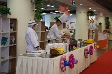 阿里巴巴餐廳的亮相,絕對是驚艷的。沒有去過現(xiàn)場的同事,也許無法體會到,但是相信在現(xiàn)場的同事,應(yīng)該是深有感觸的。整個餐廳布局合理,裝修風(fēng)格非?,F(xiàn)代,對色彩的運用也非常到位,走進餐廳,一種溫暖時尚的感覺會油然而生。在開業(yè)當(dāng)天,工作人員對現(xiàn)場進行了精心的布置,紅紅的地毯從餐廳門口一直鋪設(shè)到餐廳的售餐臺前,各種顏色的氣球從天花板垂下,鮮花、綠植、拱門,雕刻、蛋糕,飛餅表演……把餐廳裝點成了一個美麗而熱鬧的世界。餐廳的這次亮相,也讓阿里巴巴的童鞋們倍感驚艷,他們紛紛表示,源源餐廳真是不一般!