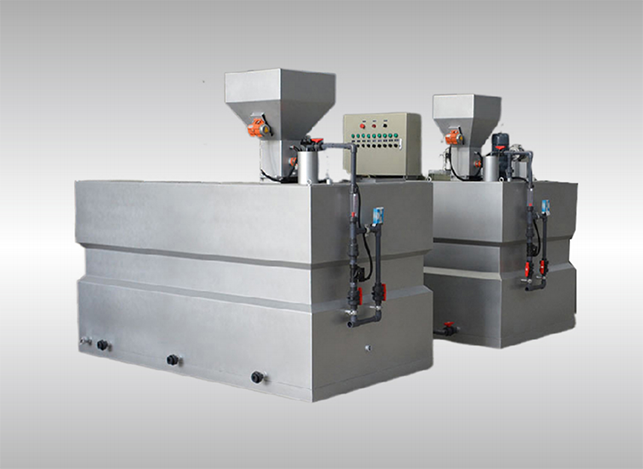 裝置工作原理:干粉絮凝劑加入干粉料斗后,按設(shè)定的配比濃度,由螺桿給料機(jī)定量輸入溶解箱內(nèi),與定量的清水混合,經(jīng)過攪拌器攪拌、熟化后,由計(jì)量泵將混合液外輸至加藥點(diǎn) 。