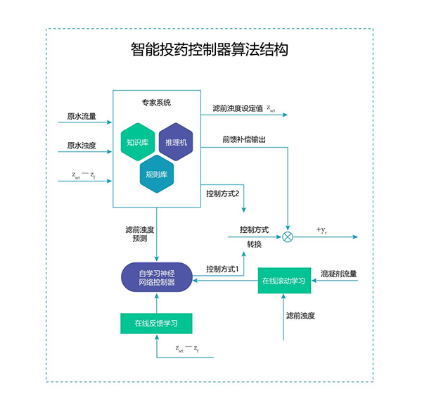 首先通過前饋專家模型采集分析源水流量、濁度、 PH 值 等數(shù)據(jù)信息并快速建模,再利用人工神經(jīng)網(wǎng)絡(luò)對(duì)模型進(jìn)行深度學(xué)習(xí),通過多步預(yù)測(cè)、滾動(dòng)優(yōu)化和反饋校正識(shí)別出加藥量和變量之間的對(duì)應(yīng)關(guān)系,最終得出最精準(zhǔn)的藥劑投加量?;苍浦悄芗铀幭到y(tǒng)可通過軟件平臺(tái)對(duì)工藝過程進(jìn)行全自動(dòng)監(jiān)控、診斷,投藥全程自動(dòng)化控制,設(shè)備故障自動(dòng)進(jìn)行切換控制;實(shí)現(xiàn)對(duì)設(shè)備運(yùn)行、藥劑消耗、水質(zhì)監(jiān)控等方面進(jìn)行實(shí)時(shí)診斷、數(shù)據(jù)分析、故障預(yù)測(cè)及報(bào)警 。